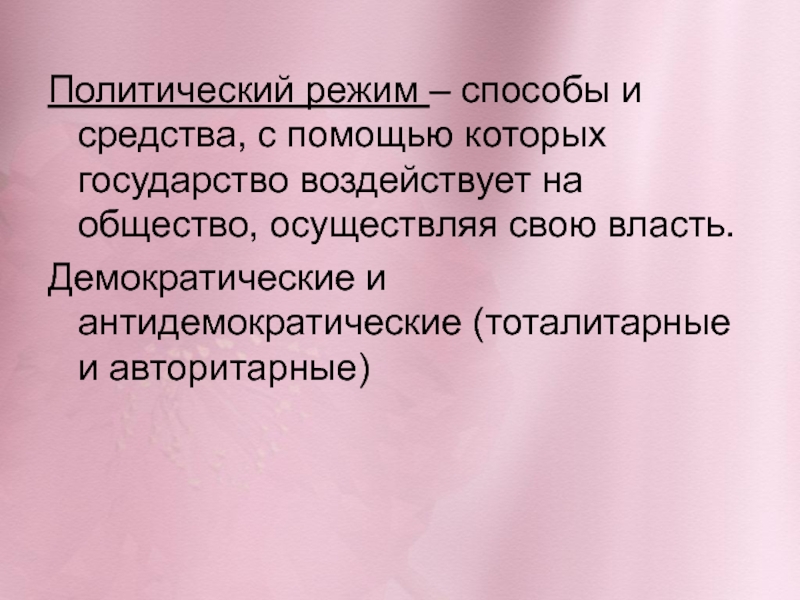 Политический режим – способы и средства, с помощью которых государство воздействует на общество, осуществляя свою власть.Демократические и антидемократические (тоталитарные и авторитарные)