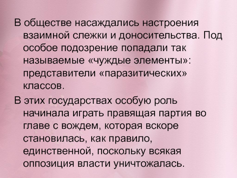 Слайд 4В обществе насаждались настроения взаимной слежки и доносительства. Под особое подозрение
