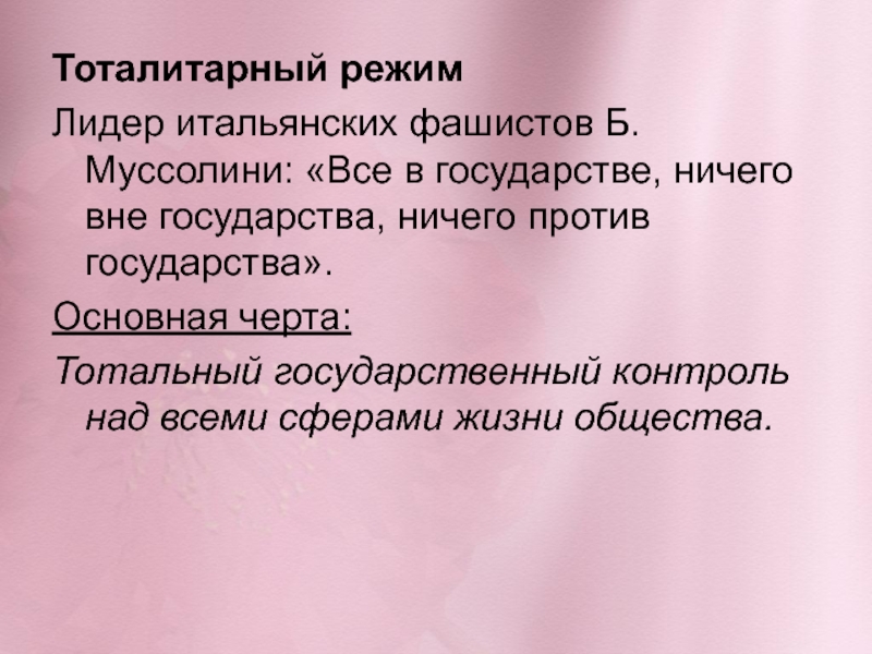 Тоталитарный режимЛидер итальянских фашистов Б.Муссолини: «Все в государстве, ничего вне государства, ничего против государства».Основная черта:Тотальный государственный контроль