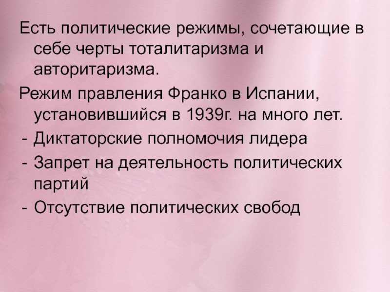Есть политические режимы, сочетающие в себе черты тоталитаризма и авторитаризма.Режим правления Франко в Испании, установившийся в 1939г.