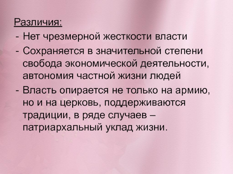 Различия:Нет чрезмерной жесткости власти Сохраняется в значительной степени свобода экономической деятельности, автономия частной жизни людейВласть опирается не