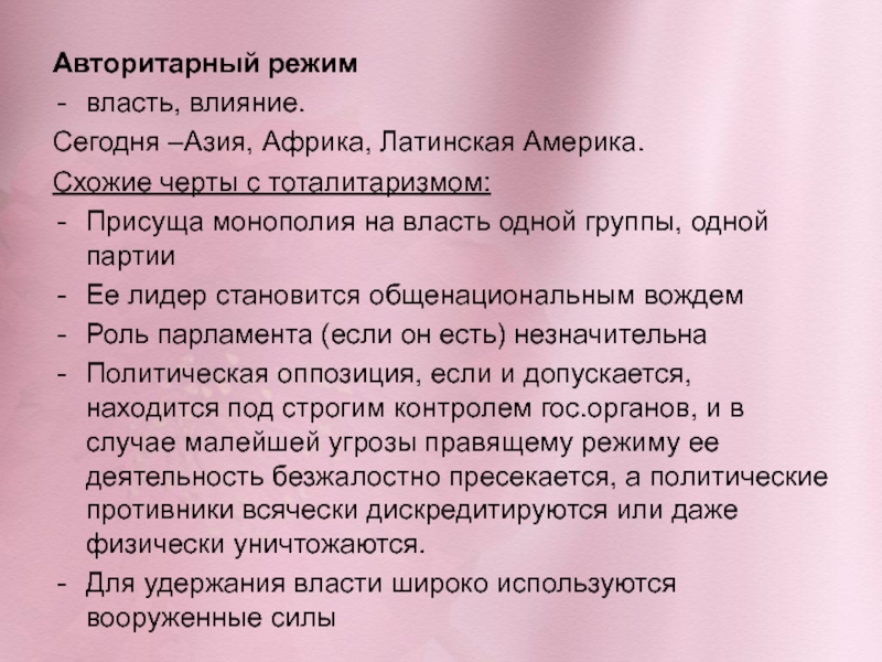 Авторитарный режимвласть, влияние.Сегодня –Азия, Африка, Латинская Америка.Схожие черты с тоталитаризмом:Присуща монополия на власть одной группы, одной партииЕе