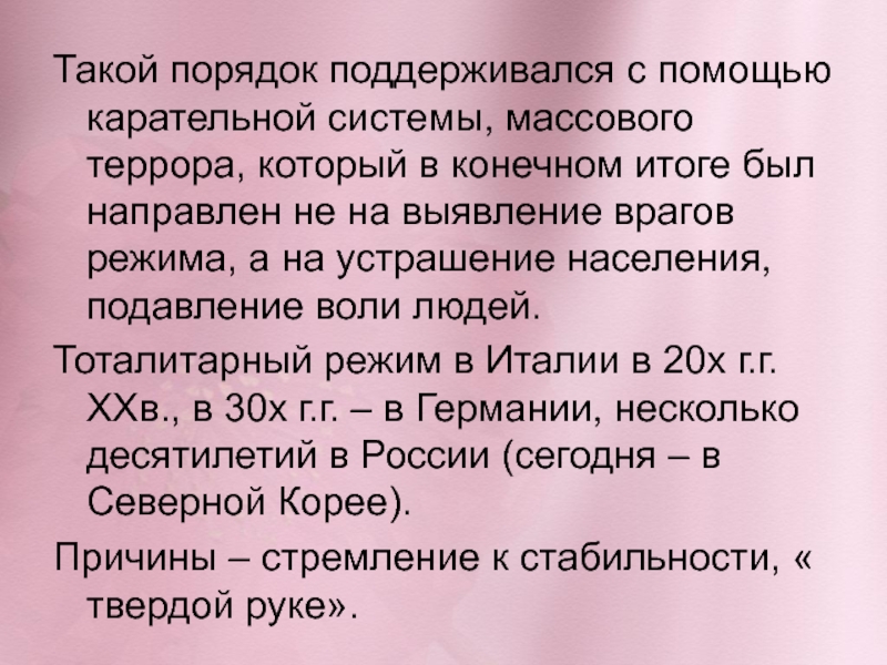 Слайд 5Такой порядок поддерживался с помощью карательной системы, массового террора, который в