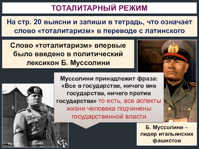 Слово «тоталитаризм» впервые было введено в политический лексикон Б. Муссолини