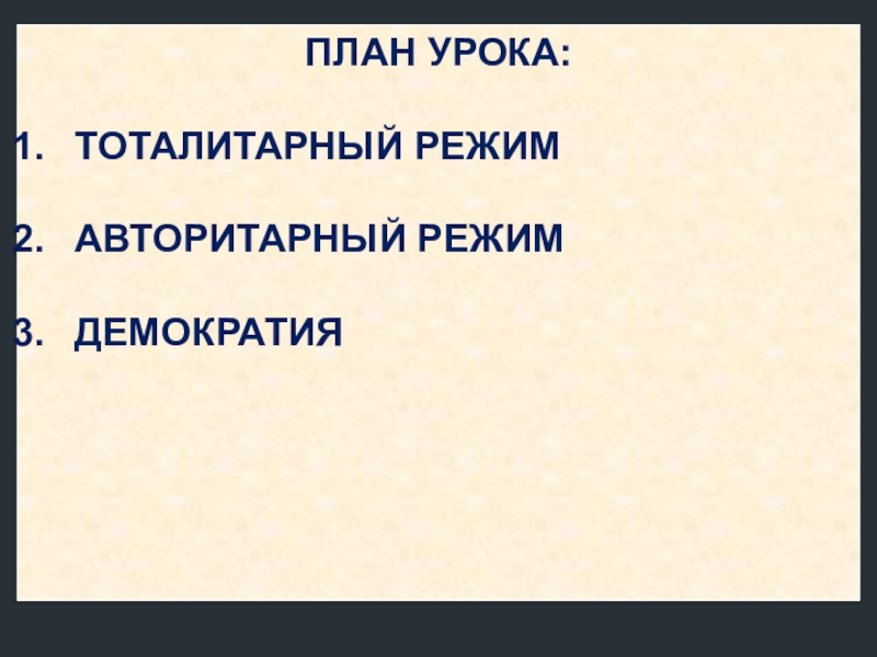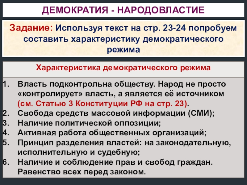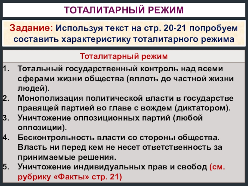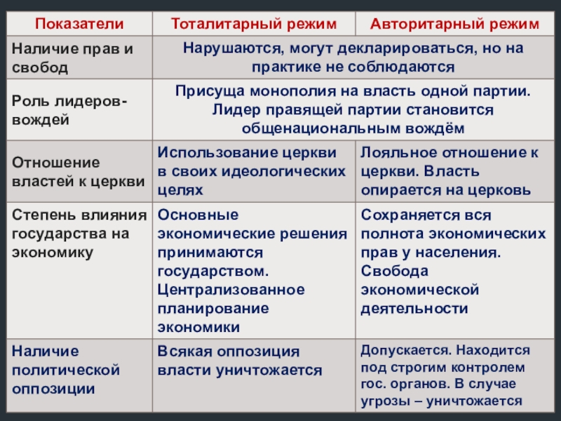 Задание: Прочитай стр. 22-23 «Авторитарный режим» и сопоставь авторитарный и тоталитарный режимы по следующим показателям: