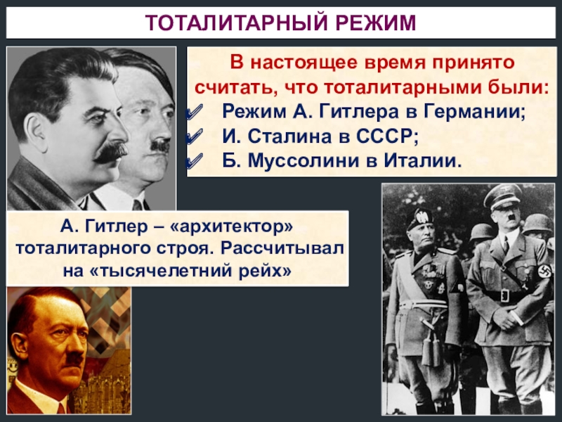 А. Гитлер – «архитектор» тоталитарного строя. Рассчитывал на «тысячелетний рейх»