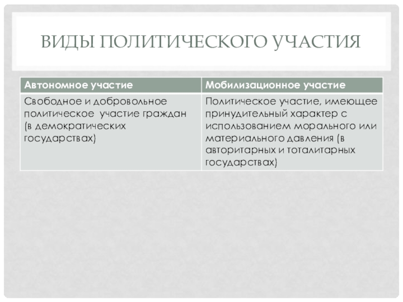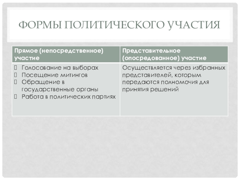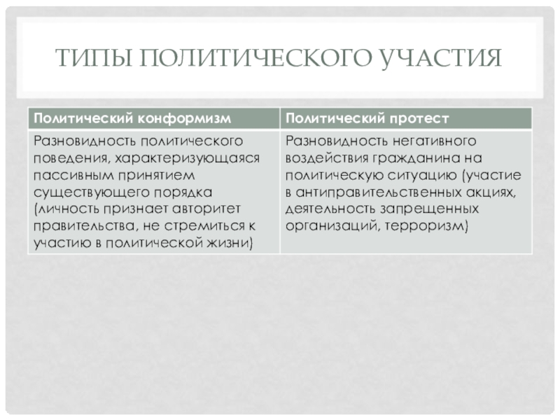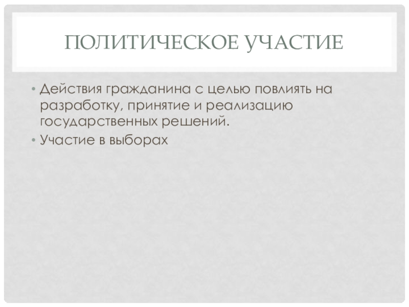 Политическое участиеДействия гражданина с целью повлиять на разработку, принятие и реализацию государственных решений.Участие в выборах