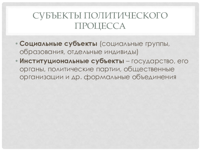 Субъекты политического процессаСоциальные субъекты (социальные группы, образования, отдельные индивиды)Институциональные субъекты – государство, его органы, политические партии, общественные