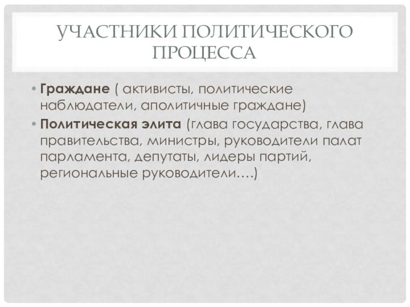 Участники политического процессаГраждане ( активисты, политические наблюдатели, аполитичные граждане)Политическая элита (глава государства, глава правительства, министры, руководители палат