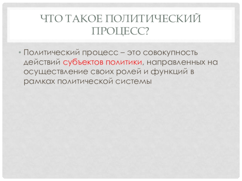 Что такое политический процесс?Политический процесс – это совокупность действий субъектов политики, направленных на осуществление своих ролей и функций в рамках политической системы