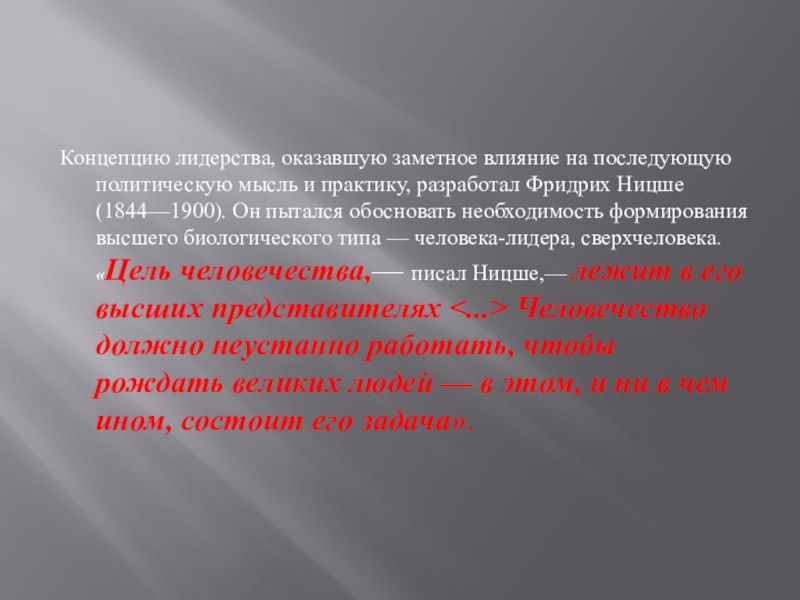 разработал Фридрих Ницше (1844—1900). Он пытался обосновать необходимость формирования высшего биологического типа — человека-лидера, сверхчеловека. «Цель человечества,— писал Ницше,— лежит в его высших представителях <...> Человечество должно неустанно работать, чтобы рождать великих людей — в этом, и ни в чем ином, состоит его задача».