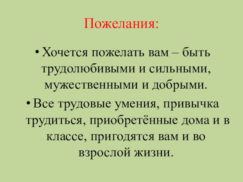 Пожелания:Хочется пожелать вам – быть трудолюбивыми и сильными, мужественными и добрыми. Все трудовые умения, привычка трудиться, приобретённые
