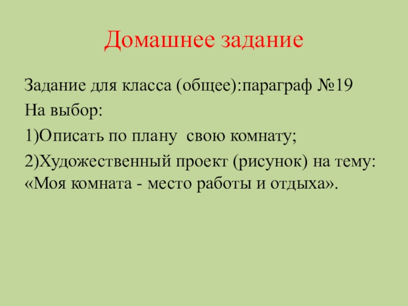 Домашнее заданиеЗадание для класса (общее):параграф №19На выбор:1)Описать по плану свою комнату;2)Художественный проект (рисунок) на тему: «Моя комната