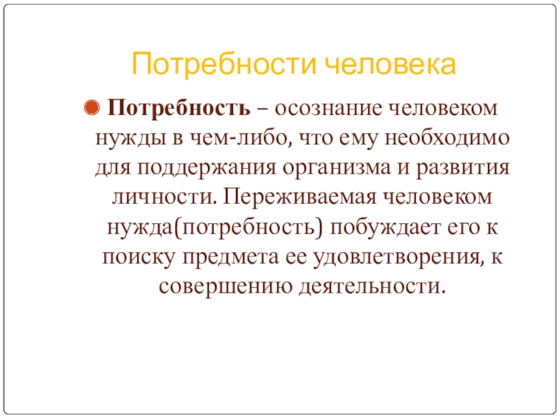 Потребности человекаПотребность – осознание человеком нужды в чем-либо, что ему необходимо для поддержания организма и развития личности. Переживаемая человеком нужда(потребность) побуждает его к поиску предмета ее удовлетворения, к совершению деятельности.