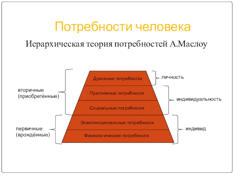Потребности человекаИерархическая теория потребностей А.Маслоупервичные (врождённые)вторичные (приобретённые)индивидиндивидуальностьличность