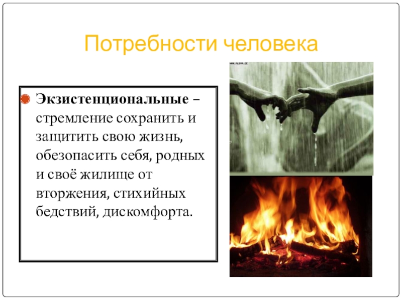 Потребности человекаЭкзистенциональные – стремление сохранить и защитить свою жизнь, обезопасить себя, родных и своё жилище от вторжения,