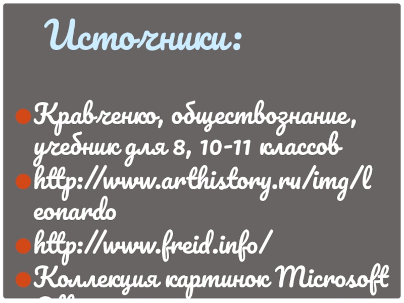 Источники:Кравченко, обществознание, учебник для 8, 10-11 классовhttp://www.arthistory.ru/img/leonardohttp://www.freid.info/Коллекция картинок Microsoft Office