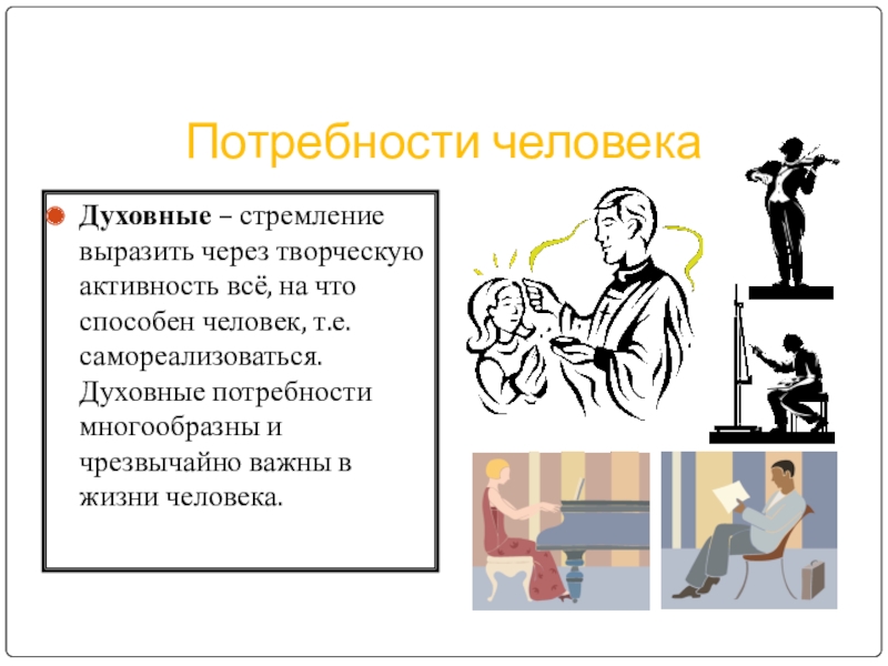 Потребности человекаДуховные – стремление выразить через творческую активность всё, на что способен человек, т.е. самореализоваться. Духовные потребности