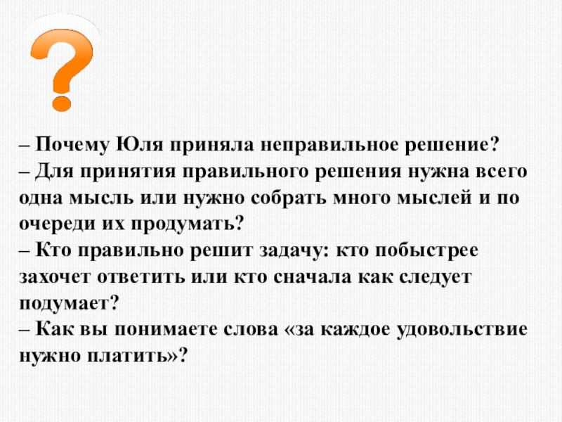 Слайд 20– Почему Юля приняла неправильное решение?