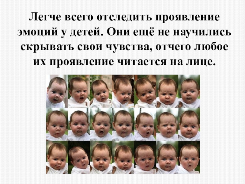 Слайд 30Легче всего отследить проявление эмоций у детей. Они ещё не научились