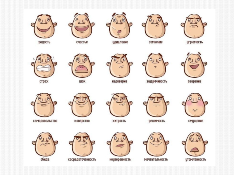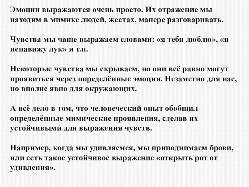 Слайд 29Эмоции выражаются очень просто. Их отражение мы находим в мимике людей,