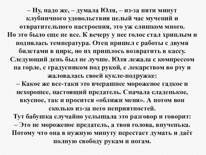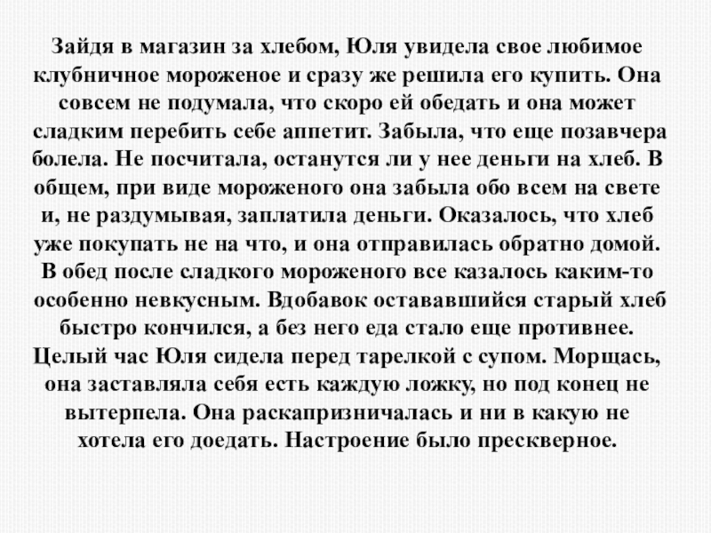и сразу же решила его купить. Она совсем не подумала, что скоро ей обедать и она может сладким перебить себе аппетит. Забыла, что еще позавчера болела. Не посчитала, останутся ли у нее деньги на хлеб. В общем, при виде мороженого она забыла обо всем на свете и, не раздумывая, заплатила деньги. Оказалось, что хлеб уже покупать не на что, и она отправилась обратно домой.