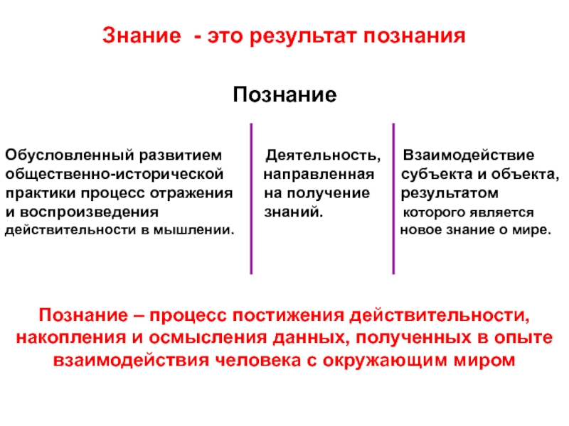 Познание – процесс постижения действительности, накопления и осмысления данных, полученных в опыте взаимодействия человека с окружающим миром