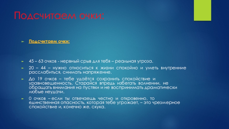 До 19 очков – тебе удаётся сохранить спокойствие и уравновешенность. Старайся впредь избегать волнении, не обращать внимания на пустяки и не воспринимать драматически любые неудачи.