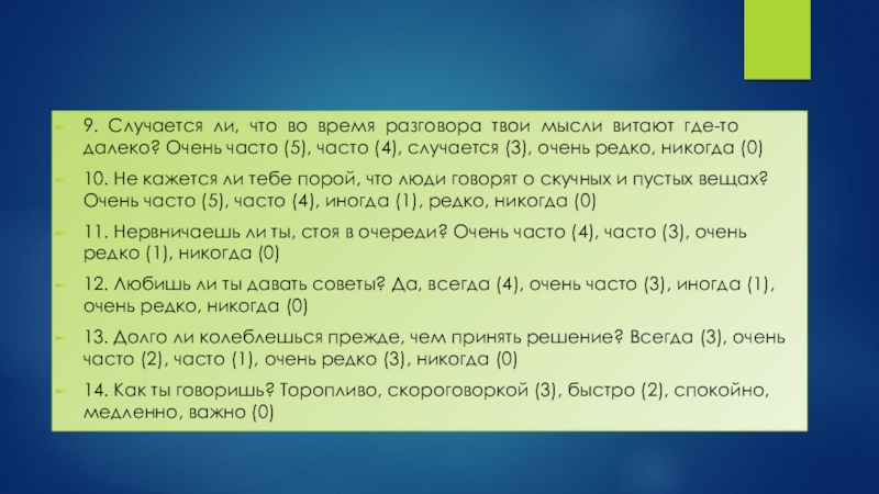 10. Не кажется ли тебе порой, что люди говорят о скучных и пустых вещах? Очень часто (5), часто (4), иногда (1), редко, никогда (0)