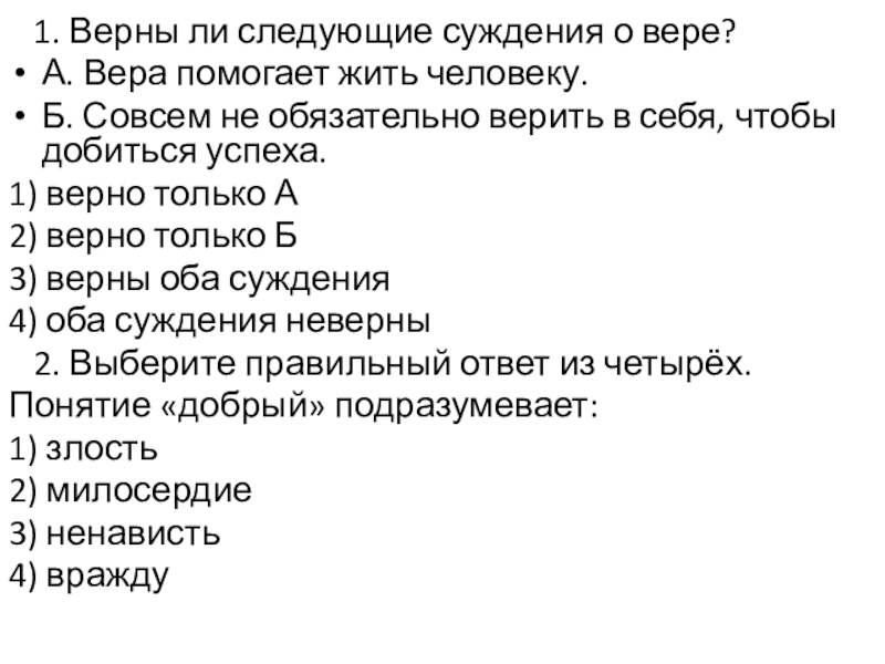 1. Верны ли следующие суждения о вере?А. Вера помогает жить человеку.Б. Совсем не обязательно верить в себя, чтобы добиться успеха.1) верно только А2) верно только Б3) верны оба суждения4) оба суждения неверны 2. Выберите правильный ответ из четырёх.Понятие «добрый»