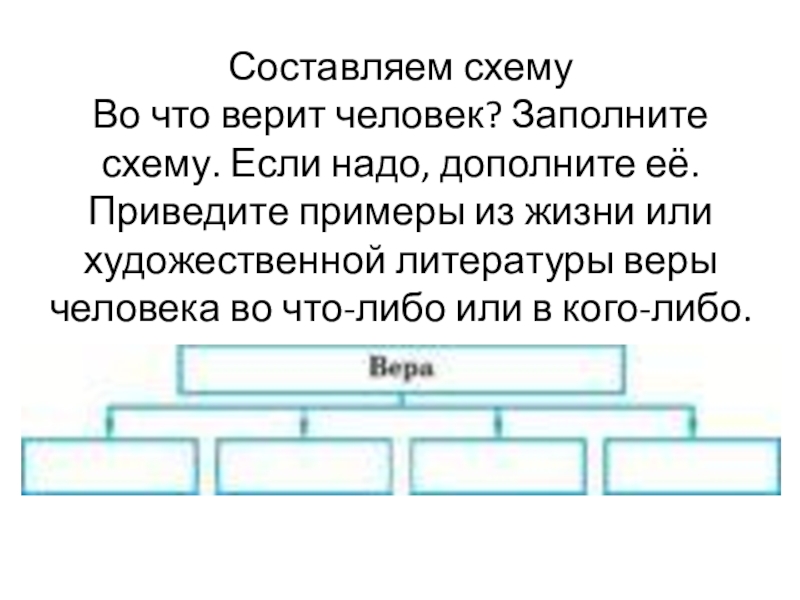 Слайд 4Составляем схему Во что верит человек? Заполните схему. Если надо, дополните её.