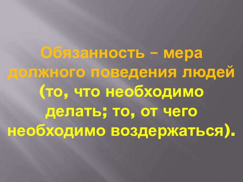 Обязанность – мера должного поведения людей (то, что необходимо делать; то, от чего необходимо воздержаться).