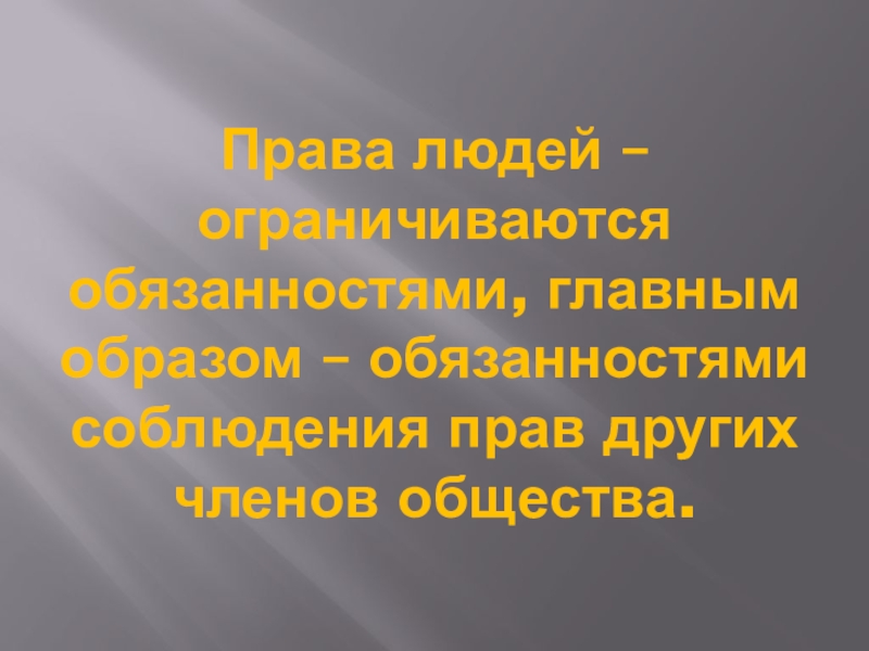 Слайд 36Права людей – ограничиваются обязанностями, главным образом – обязанностями соблюдения прав