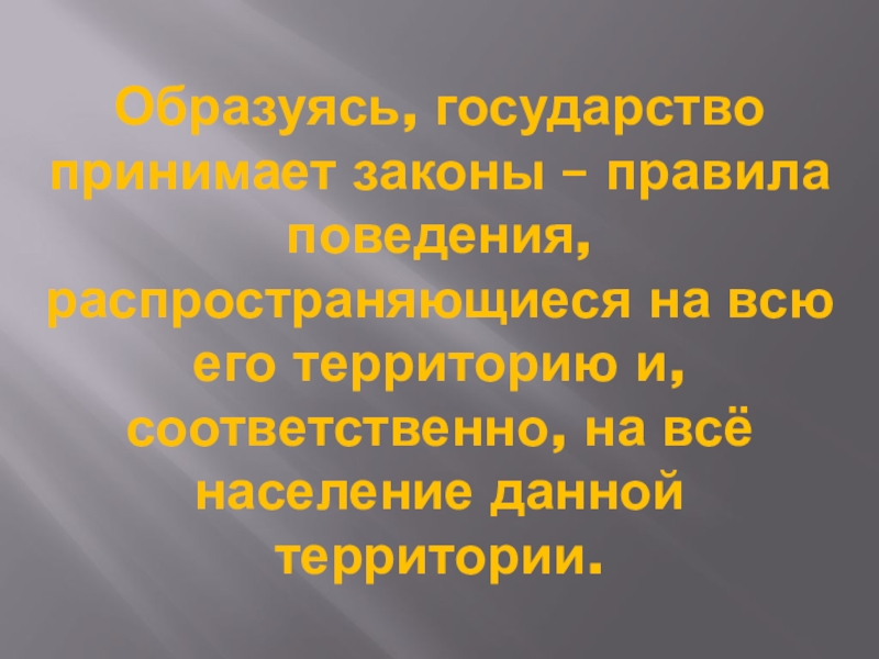 Образуясь, государство принимает законы – правила поведения, распространяющиеся на всю его территорию и, соответственно, на всё население