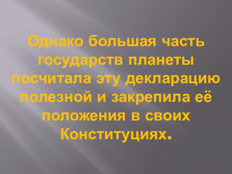 Однако большая часть государств планеты посчитала эту декларацию полезной и закрепила её положения в своих Конституциях.