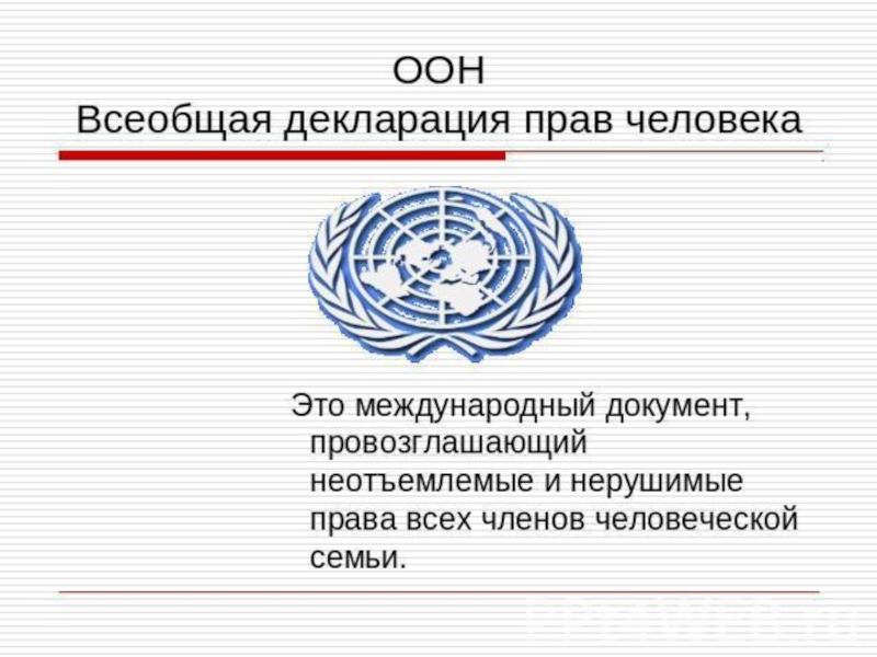 наций (ООН), которая в 1948 году приняла международный документ, определивший круг основных прав и свобод человека – Всеобщую декларацию прав человека.