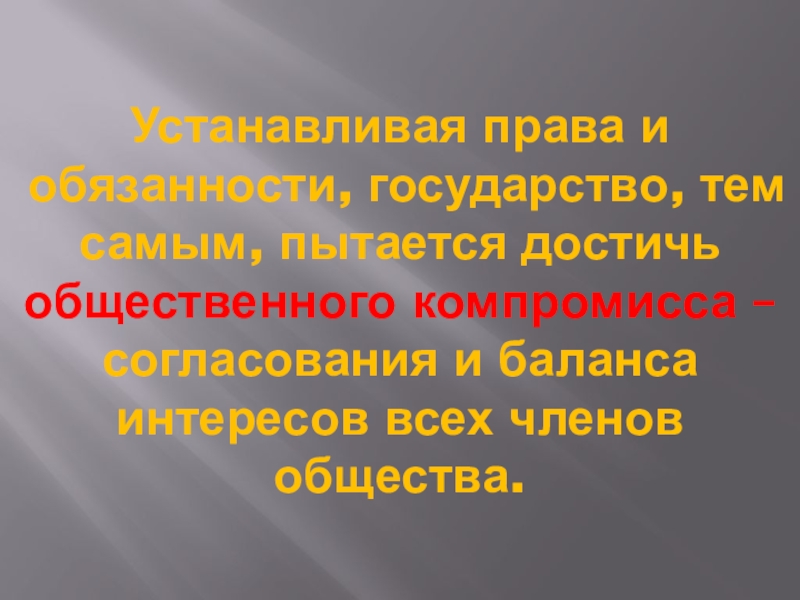 Устанавливая права и обязанности, государство, тем самым, пытается достичь общественного компромисса – согласования и баланса интересов всех