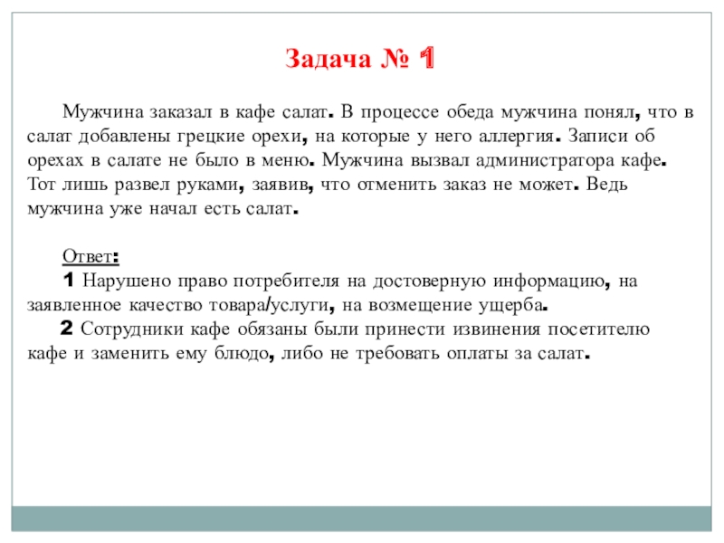 понял, что в салат добавлены грецкие орехи, на которые у него аллергия. Записи об орехах в салате не было в меню. Мужчина вызвал администратора кафе. Тот лишь развел руками, заявив, что отменить заказ не может. Ведь мужчина уже начал есть салат.