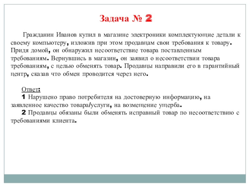 своему компьютеру, изложив при этом продавцам свои требования к товару. Придя домой, он обнаружил несоответствие товара поставленным требованиям. Вернувшись в магазин, он заявил о несоответствии товара
