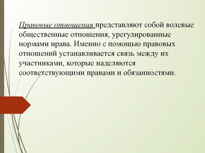 Слайд 22Правовые отношения представляют собой волевые общественные отношения, урегулированные нормами нрава. Именно