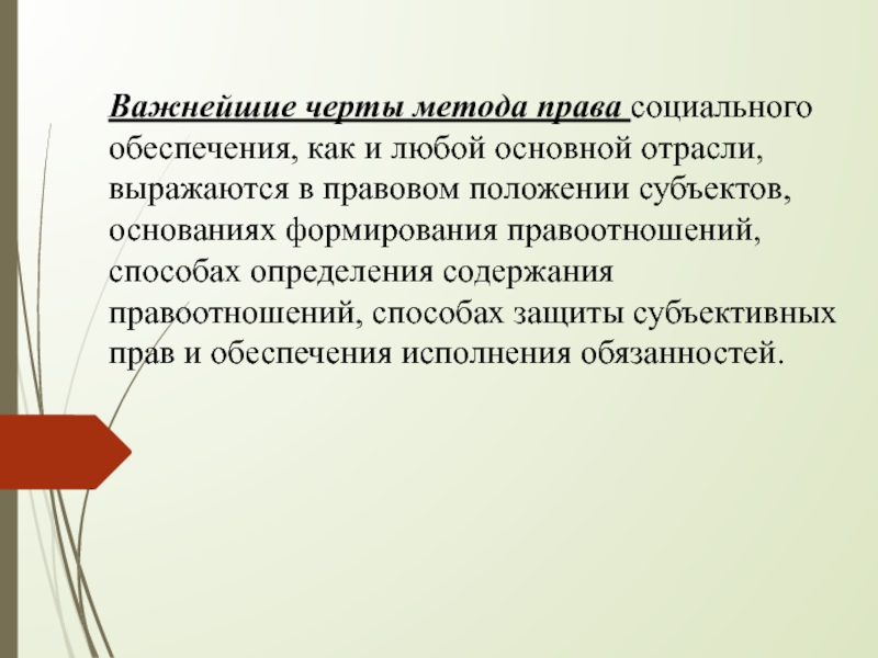 Слайд 19Важнейшие черты метода права социального обеспечения, как и любой основной отрасли,