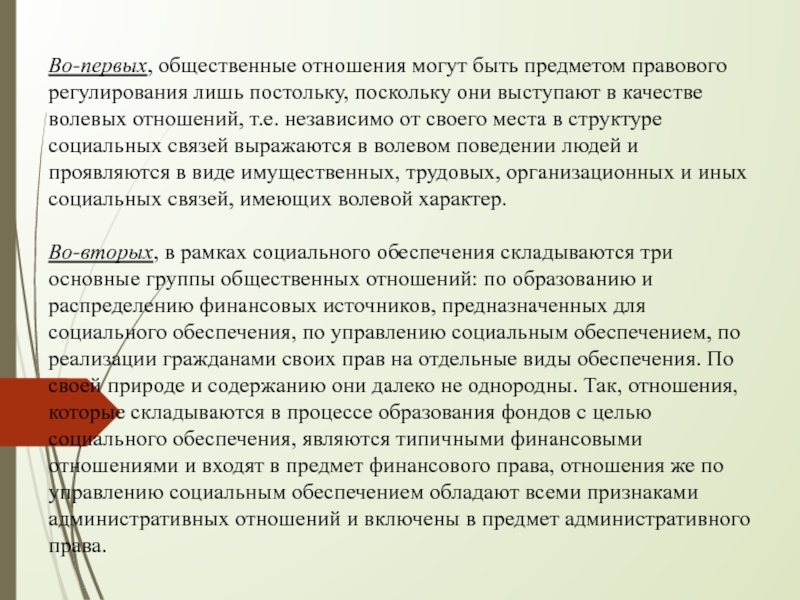 Слайд 12Во-первых, общественные отношения могут быть предметом правового регулирования лишь постольку, поскольку