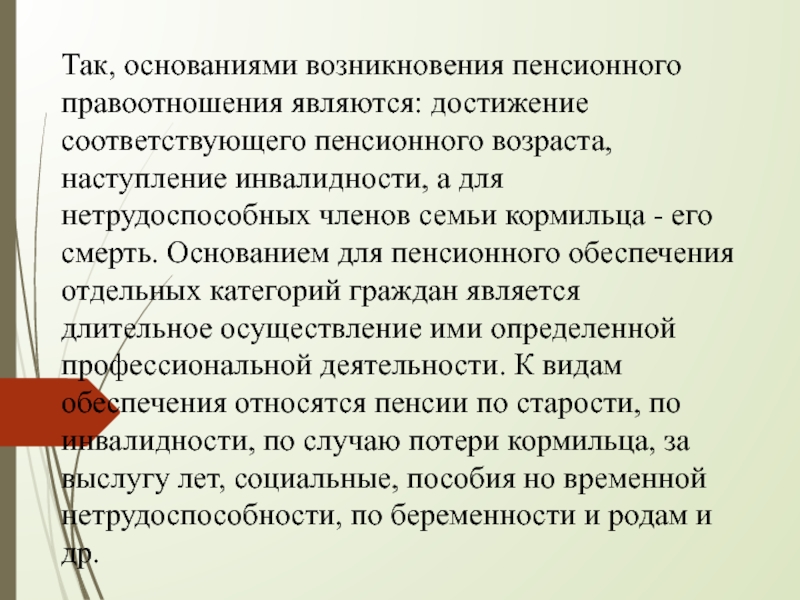Слайд 8Так, основаниями возникновения пенсионного правоотношения являются: достижение соответствующего пенсионного возраста, наступление