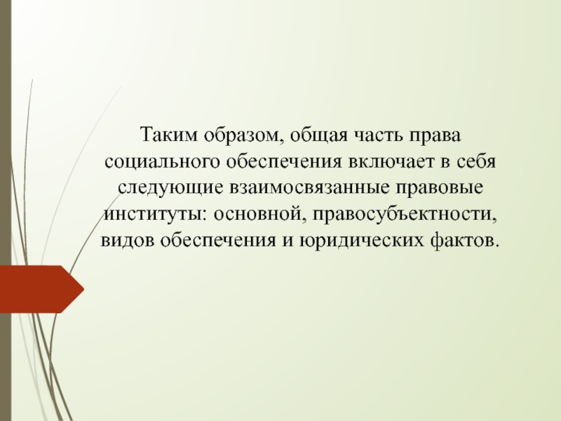 Слайд 9Таким образом, общая часть права социального обеспечения включает в себя следующие