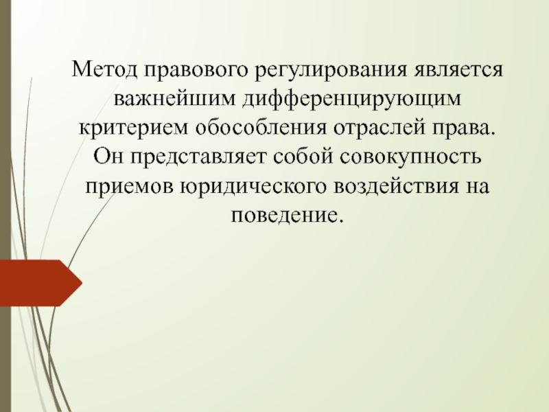 Слайд 18Метод правового регулирования является важнейшим дифференцирующим критерием обособления отраслей права. Он