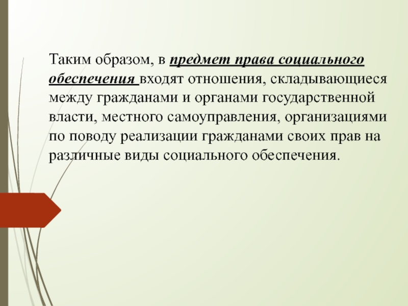 Слайд 13Таким образом, в предмет права социального обеспечения входят отношения, складывающиеся между