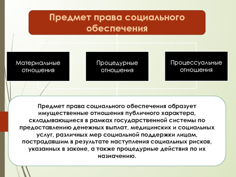 имущественные отношения публичного характера, складывающиеся в рамках государственной системы по предоставлению денежных выплат, медицинских и социальных услуг, различных мер социальной поддержки лицам, пострадавшим в результате наступления социальных рисков, указанных в законе, а также процедурные действия по их назначению.