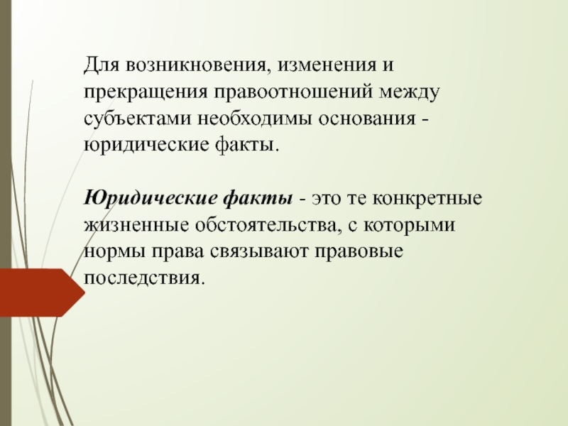 Слайд 26Для возникновения, изменения и прекращения правоотношений между субъектами необходимы основания -