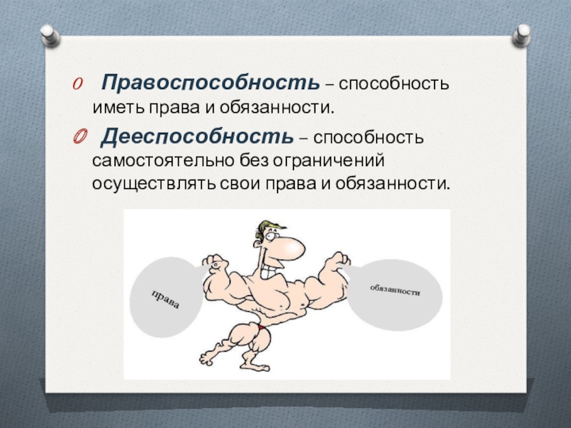 Слайд 5 Правоспособность – способность иметь права и обязанности.
