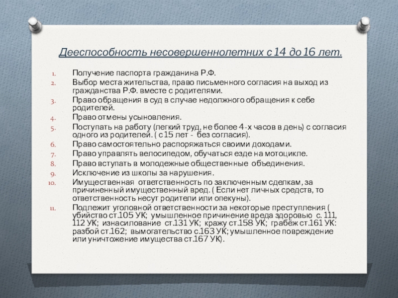 Дееспособность несовершеннолетних с 14 до 16 лет. Получение паспорта гражданина Р.Ф.Выбор места жительства, право письменного согласия на выход
